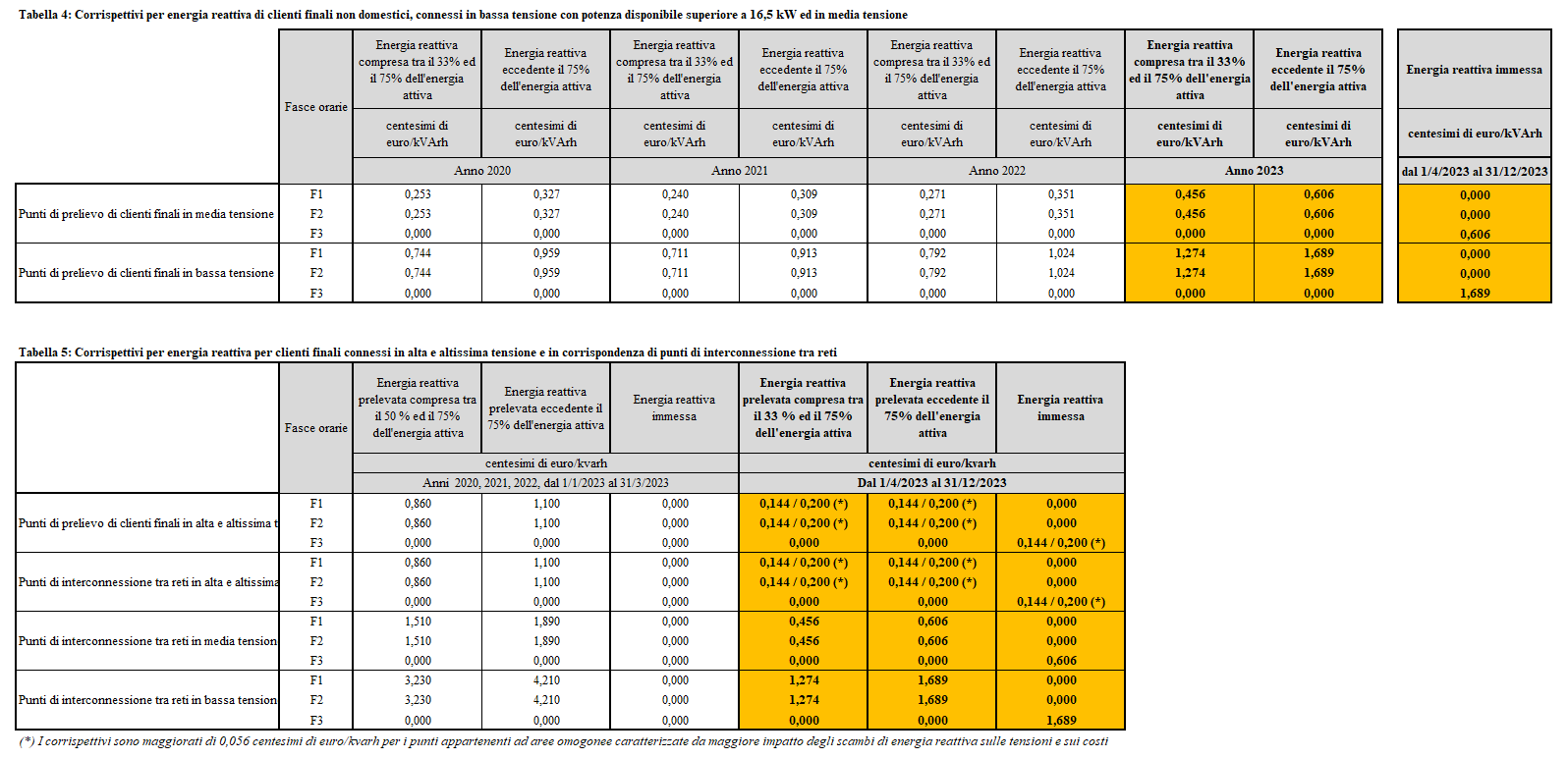 I valori per il calcolo delle penali conseguenti il prelievo di Energia Reattiva dalla rete, sono definiti di anno in anno dall’Autorità per l’Energia Elettrica, il Gas ed il Sistema Idrico (AEEG); con la Delibera 27 dicembre 2022 720/2022/R/eel sono state definite le tariffe per l’anno 2023 che hanno subito modifiche in aumento di oltre 60% rispetto all’anno precedente.