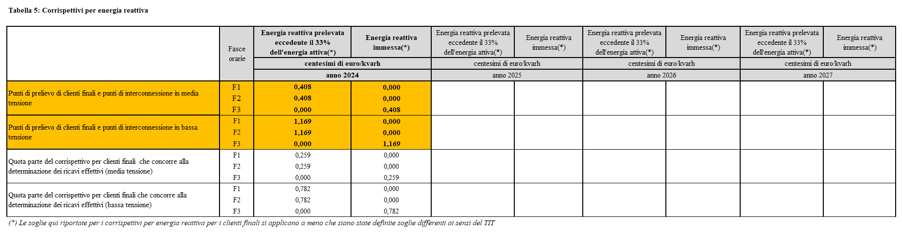 I valori per il calcolo delle penali conseguenti il prelievo e immissione di Energia Reattiva dalla rete, sono definiti di anno in anno dall’Autorità per l’Energia Elettrica, il Gas ed il Sistema Idrico (AEEG); con la Delibera 27 dicembre 2023 616/2023/R/eel e la successiva Delibera 28 dicembre 2023 630/2023/R/eel sono state definite le tariffe per l’anno 2024 che hanno subito modifiche sostanziali rispetto all’anno precedente.