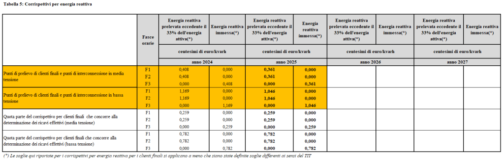 - per energia reattiva oltre il 33% della attiva (F1 e F2): 0,361 centesimi di euro/kvarh [0,408 nel 2024]